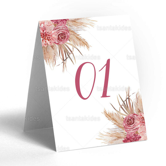 Δίπτυχη κάρτα αρίθμησης τραπεζιού γάμου εκτυπωμένη με θέμα dried flowers and pampas