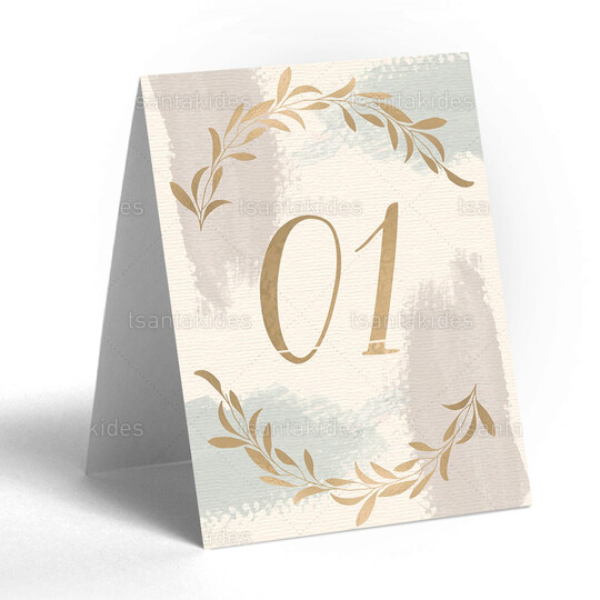 Δίπτυχη κάρτα αρίθμησης τραπεζιού γάμου εκτυπωμένη με θέμα λιτό, chic σχεδιασμό, watercolor και χρυσά κλαδιά