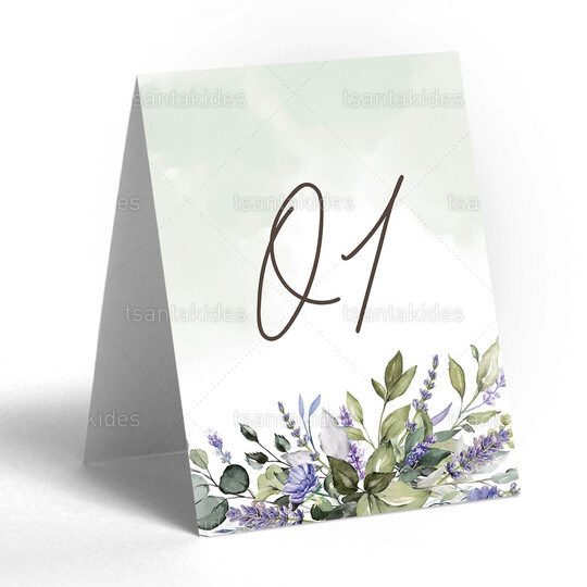 Δίπτυχη κάρτα αρίθμησης τραπεζιού γάμου εκτυπωμένη με θέμα greenery στοιχεία και λεβάντα