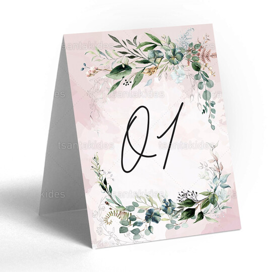 Δίπτυχη κάρτα αρίθμησης τραπεζιού γάμου εκτυπωμένη με θέμα greenery και στοιχεία από λουλούδια και ευκάλυπτο