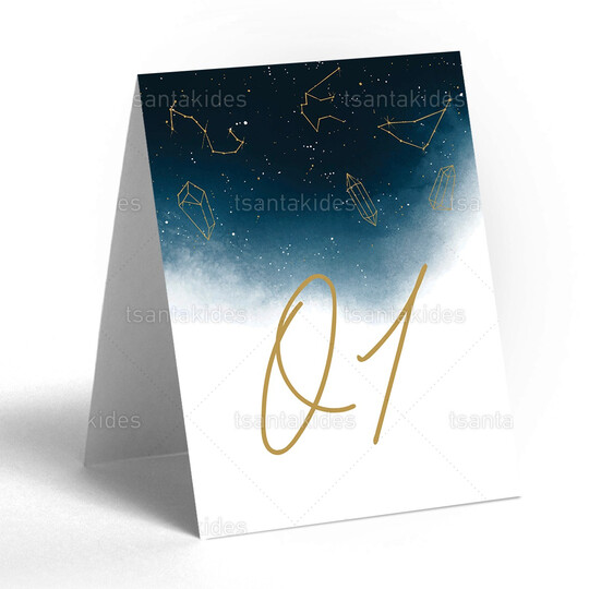 Δίπτυχη κάρτα αρίθμησης τραπεζιού γάμου εκτυπωμένη με θέμα αστερισμούς