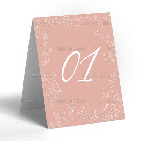 Δίπτυχη κάρτα αρίθμησης τραπεζιού γάμου εκτυπωμένη με θέμα γραμμικά λουλούδια σε σάπιο μήλο background