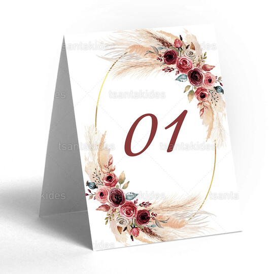 Δίπτυχη κάρτα αρίθμησης τραπεζιού γάμου εκτυπωμένη με θέμα Burgundy Roses