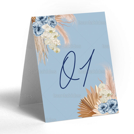 Δίπτυχη κάρτα αρίθμησης τραπεζιού γάμου εκτυπωμένη με θέμα Dusty Blue Pampas