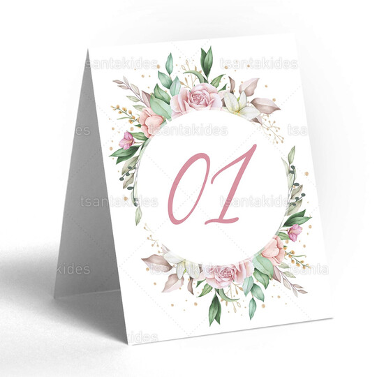 Δίπτυχη κάρτα αρίθμησης τραπεζιού γάμου εκτυπωμένη με θέμα Flower Romance