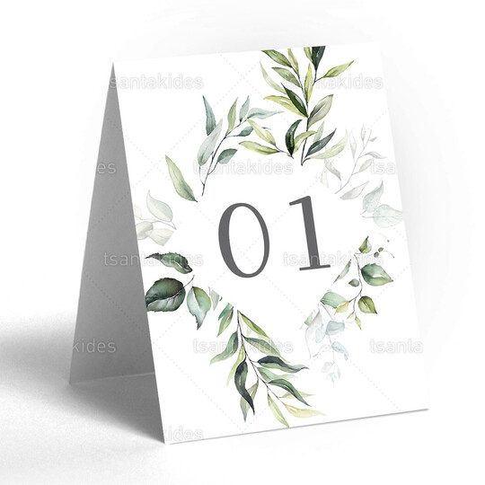 Δίπτυχη κάρτα αρίθμησης τραπεζιού γάμου εκτυπωμένη με θέμα Greenery
