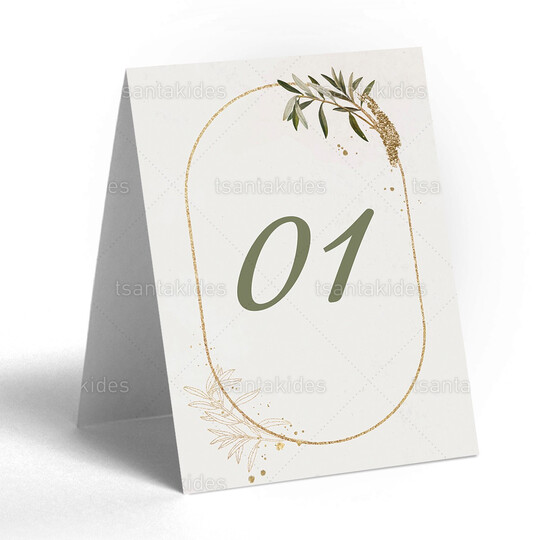 Δίπτυχη κάρτα αρίθμησης τραπεζιού γάμου εκτυπωμένη με θέμα Gold Olive Brush