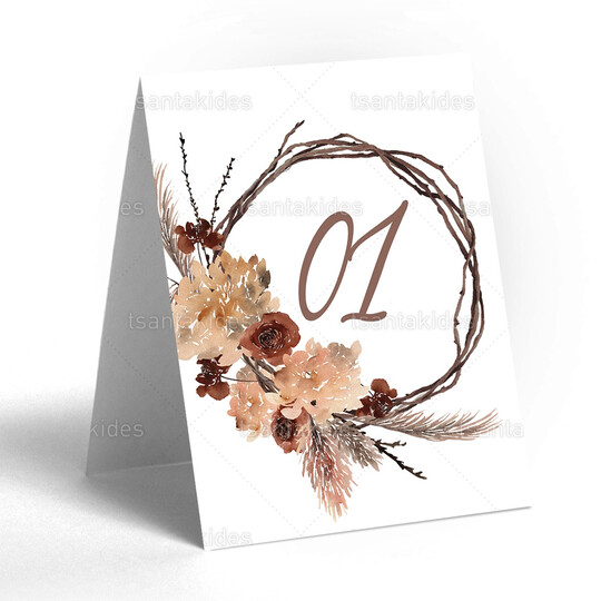 Δίπτυχη κάρτα αρίθμησης τραπεζιού γάμου εκτυπωμένη με θέμα Rustic Wreath
