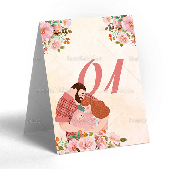 Δίπτυχη κάρτα αρίθμησης τραπεζιού γάμου εκτυπωμένη με θέμα Couple and Daughter