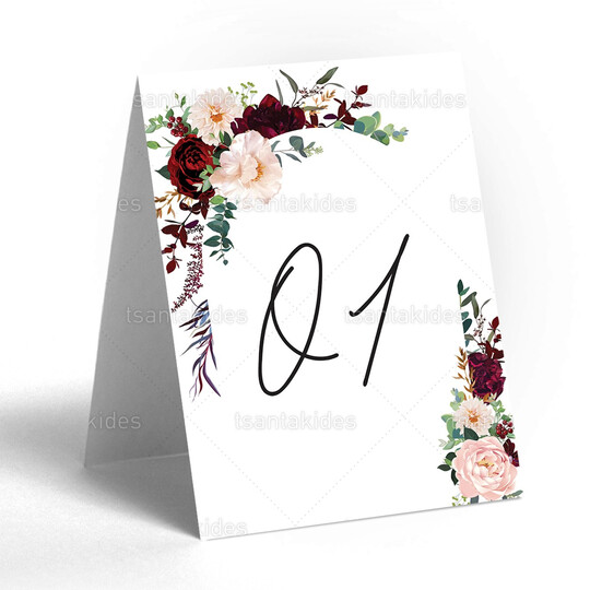 Δίπτυχη κάρτα αρίθμησης τραπεζιού γάμου εκτυπωμένη με θέμα floral σχεδιασμό σε burgundy και ροζ pastel χρωματισμούς
