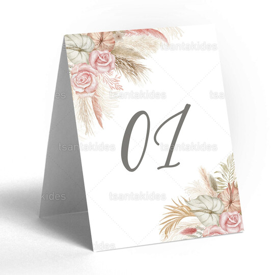 Δίπτυχη κάρτα αρίθμησης τραπεζιού γάμου εκτυπωμένη με θέμα bohemian ύφος και pampas λουλούδια