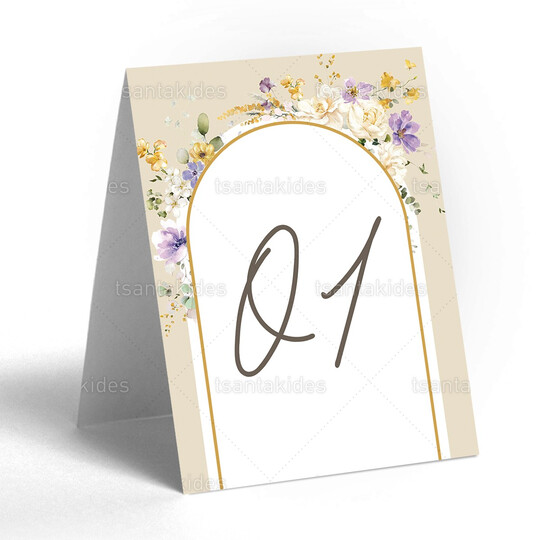 Δίπτυχη κάρτα αρίθμησης τραπεζιού γάμου εκτυπωμένη με θέμα χρυσή αψίδα και σύνθεση από pastel λιλά και κίτρινα λουλούδια