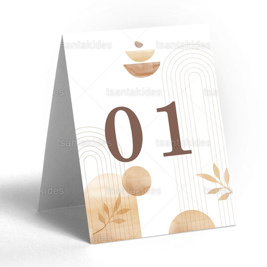 Δίπτυχη κάρτα αρίθμησης τραπεζιού γάμου εκτυπωμένη με θέμα abstract, με γήινες αποχρώσεις