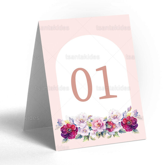 Δίπτυχη κάρτα αρίθμησης τραπεζιού γάμου εκτυπωμένη με θέμα floral διάκοσμο σε αψίδα