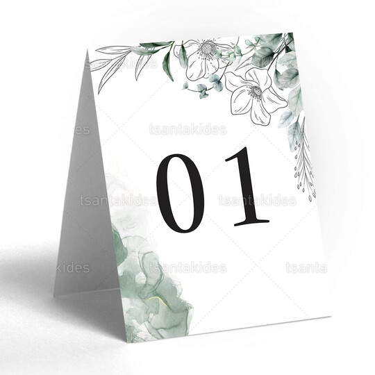 Δίπτυχη κάρτα αρίθμησης τραπεζιού γάμου εκτυπωμένη με θέμα watercolor σε αποχρώσεις του ευκάλυπτου