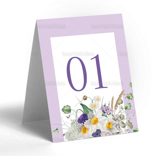 Δίπτυχη κάρτα αρίθμησης τραπεζιού γάμου εκτυπωμένη με θέμα floral μπουκέτο σε λιλά χρωματισμούς