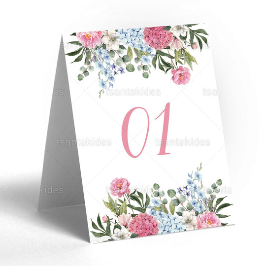 Δίπτυχη κάρτα αρίθμησης τραπεζιού γάμου εκτυπωμένη με θέμα floral σύνθεση από γαλάζιες και ροζ ορτανσίες