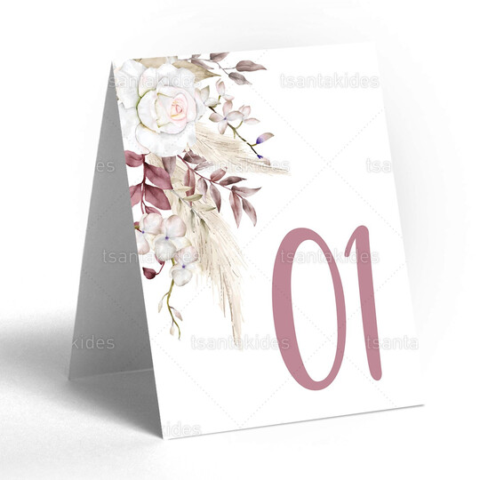 Δίπτυχη κάρτα αρίθμησης τραπεζιού γάμου εκτυπωμένη με θέμα Dusty pink boho pampas