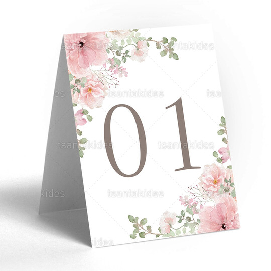 Δίπτυχη κάρτα αρίθμησης τραπεζιού γάμου εκτυπωμένη με θέμα Flower romance