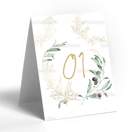 Δίπτυχη κάρτα αρίθμησης τραπεζιού γάμου εκτυπωμένη με θέμα Olive wreath