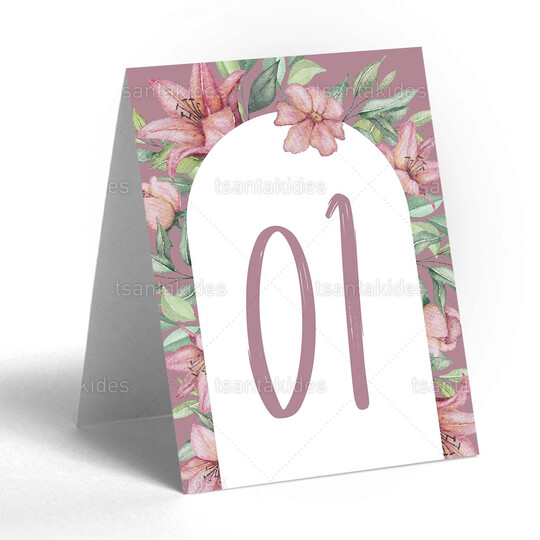 Δίπτυχη κάρτα αρίθμησης τραπεζιού γάμου εκτυπωμένη με θέμα Dusty pink lilly flowers