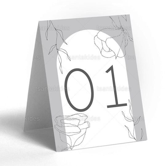 Δίπτυχη κάρτα αρίθμησης τραπεζιού γάμου εκτυπωμένη με θέμα Minimal grey silver flowers