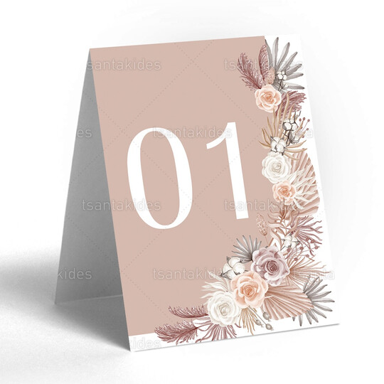 Δίπτυχη κάρτα αρίθμησης τραπεζιού γάμου εκτυπωμένη με θέμα Boho rose pampas
