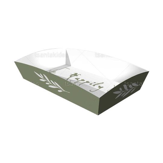 Κουτί πιατάκι εκτυπωμένο με θέμα λαδί αποχρώσεις και λογότυπο η ημερομηνία με κλαδιά ελιάς