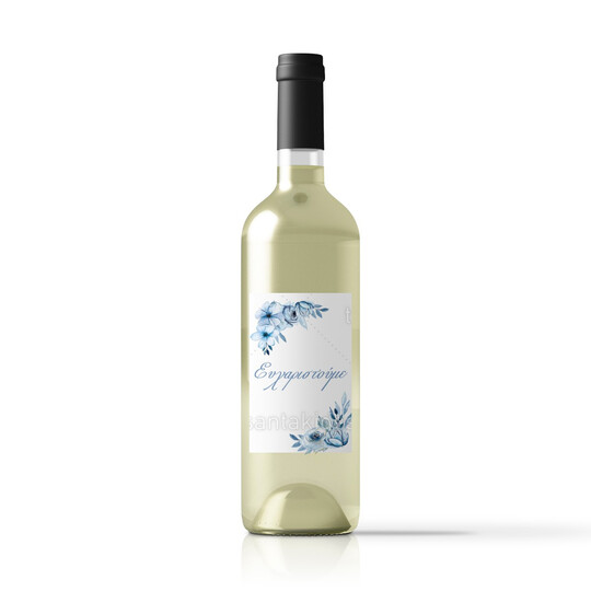 Αυτοκόλλητη ετικέτα κρασιού για τη δεξίωση του γάμου εκτυπωμένη με floral σχεδιασμό σε γαλάζιους pastel χρωματισμούς