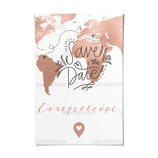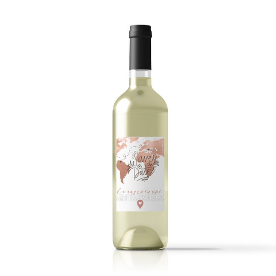 Αυτοκόλλητη ετικέτα κρασιού για τη δεξίωση του γάμου εκτυπωμένη σε travel, save the date και rose gold χρωματισμούς