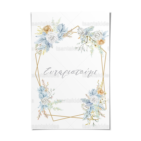 Αυτοκόλλητη ετικέτα κρασιού για τη δεξίωση του γάμου εκτυπωμένη με dusty blue λουλούδια και χρυσό γεωμετρικό σχήμα