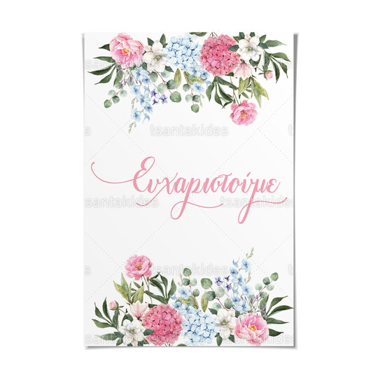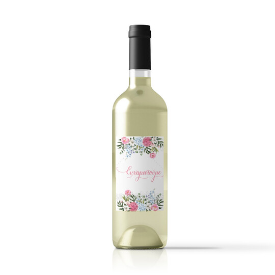 Αυτοκόλλητη ετικέτα κρασιού για τη δεξίωση του γάμου εκτυπωμένη με floral σύνθεση από γαλάζιες και ροζ ορτανσίες