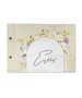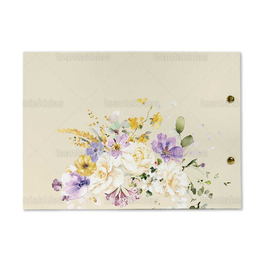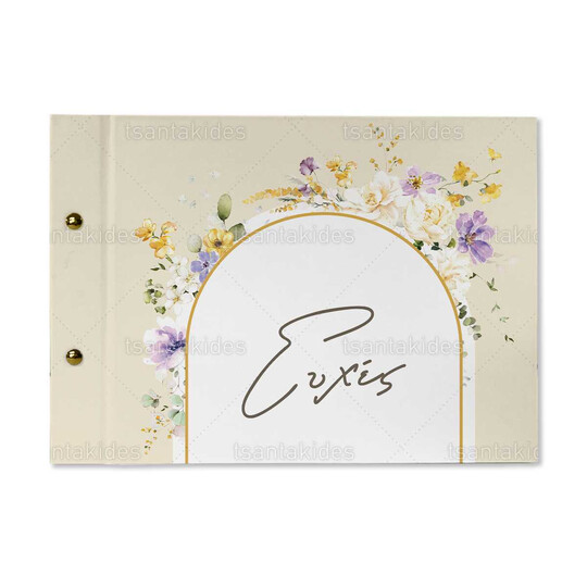 Βιβλίο ευχών εκτυπωμένο με χρυσή αψίδα και σύνθεση από pastel λιλά και κίτρινα λουλούδια