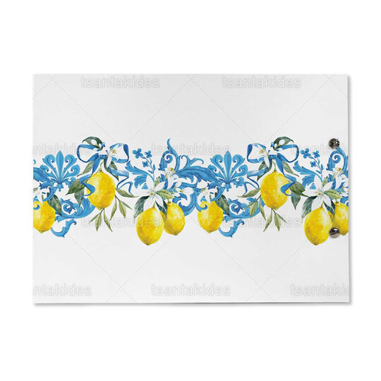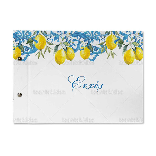 Βιβλίο ευχών εκτυπωμένο με λεμόνια και μπλε ρουά χρωματισμούς εμπνευσμένο από τα μαγιόλικα ιταλικά κεραμικά