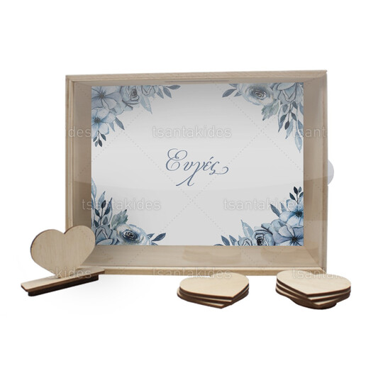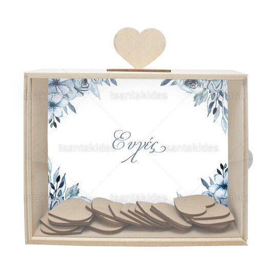 Ξύλινο κουτί ευχών γάμου εκτυπωμένο με floral σχεδιασμό σε γαλάζιους pastel χρωματισμούς