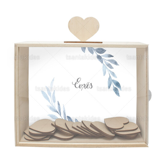 Το κουτί συνοδεύεται από 50 ατύπωτες ξύλινες καρδιές για τις ευχές και μια ξύλινη καρδιά-καπάκι για την θυρίδα στο πάνω μέρος του κουτιού.