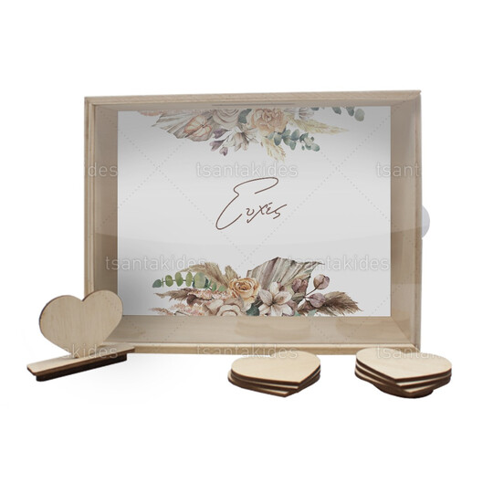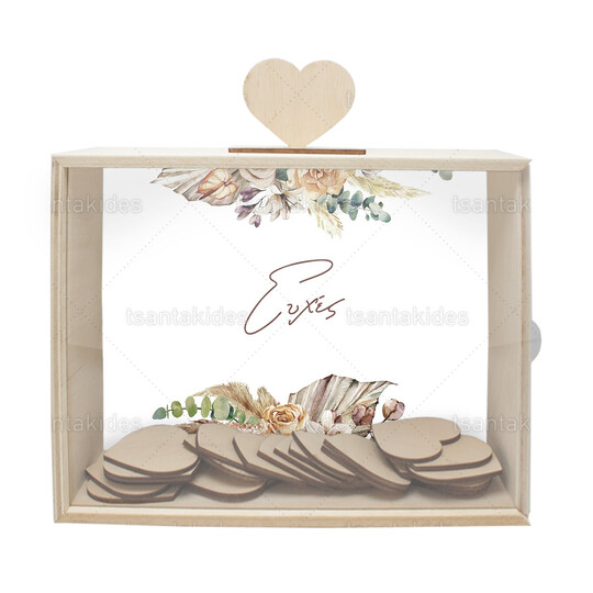 Ξύλινο κουτί ευχών γάμου εκτυπωμένο με floral στοιχεία και pampas