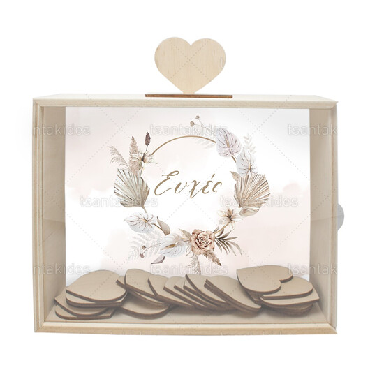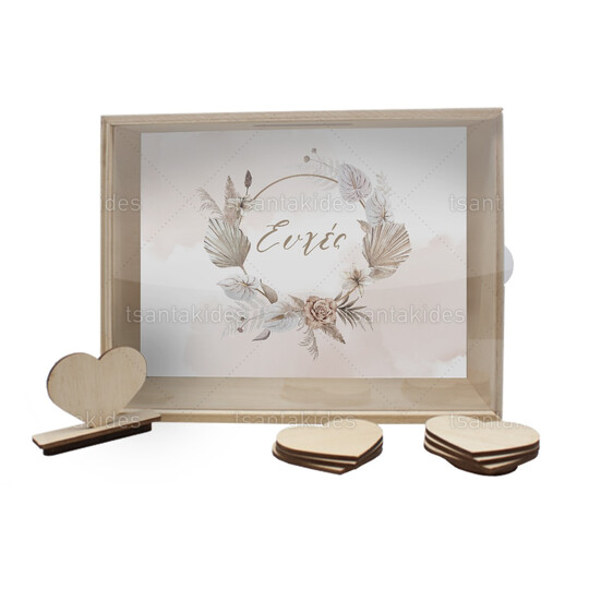 Ξύλινο κουτί ευχών γάμου εκτυπωμένο με κυκλικό στεφανάκι από pampas