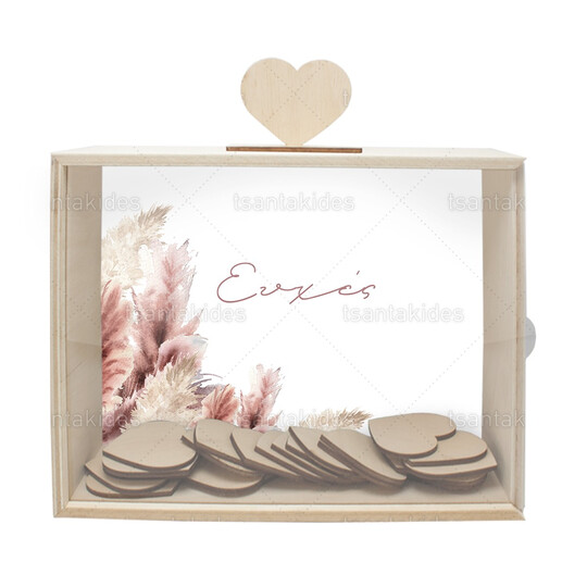 Ξύλινο κουτί ευχών γάμου εκτυπωμένο με pampas