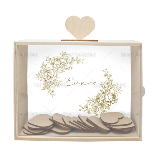 Ξύλινο κουτί ευχών γάμου εκτυπωμένο με λιτό σχεδιασμό και χρυσές λεπτομέρειες