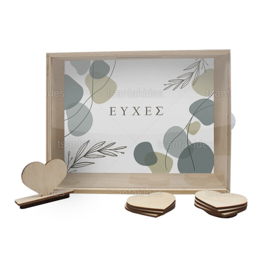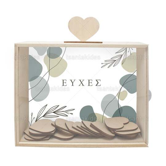 Ξύλινο κουτί ευχών γάμου εκτυπωμένο με minimal σχεδιασμό και sage green στοιχεία