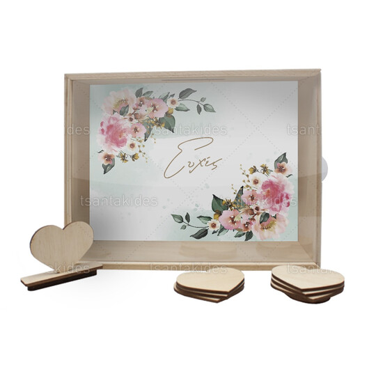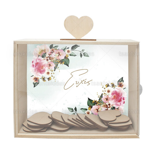 Ξύλινο κουτί ευχών γάμου εκτυπωμένο με pink floral σχεδιασμό