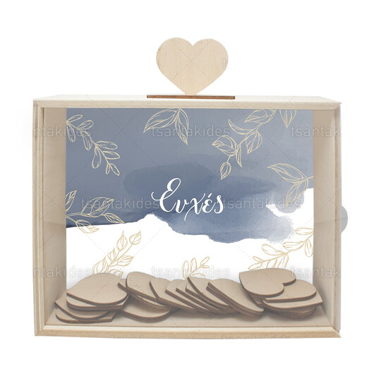 Το κουτί συνοδεύεται από 50 ατύπωτες ξύλινες καρδιές για τις ευχές και μια ξύλινη καρδιά-καπάκι για την θυρίδα στο πάνω μέρος του κουτιού.