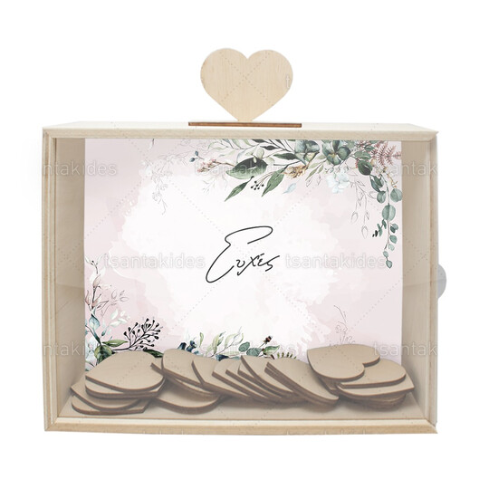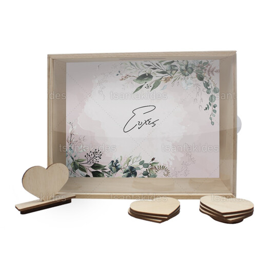 Ξύλινο κουτί ευχών γάμου εκτυπωμένο με greenery και στοιχεία από λουλούδια και ευκάλυπτο