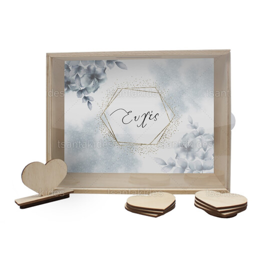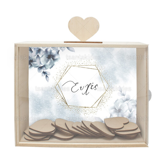 Ξύλινο κουτί ευχών γάμου εκτυπωμένο με dusty blue λουλούδια και χρυσές λεπτομέρειες