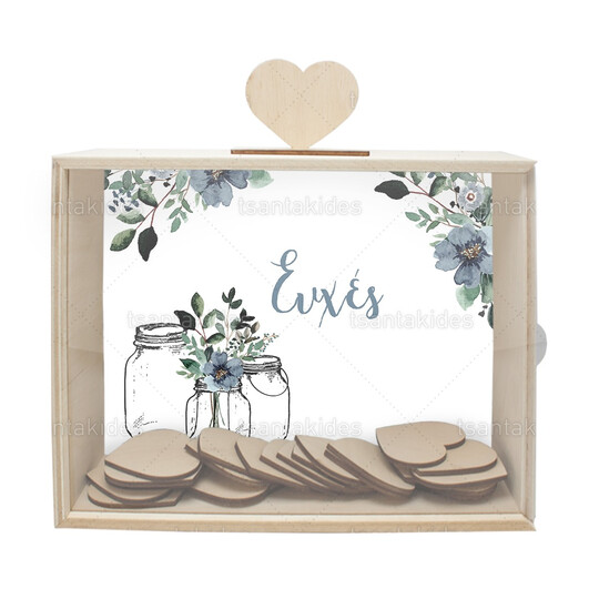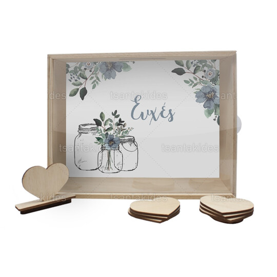 Ξύλινο κουτί ευχών γάμου εκτυπωμένο με λουλούδια σε βαζάκια