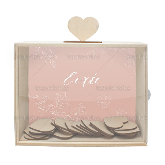 Το κουτί συνοδεύεται από 50 ατύπωτες ξύλινες καρδιές για τις ευχές και μια ξύλινη καρδιά-καπάκι για την θυρίδα στο πάνω μέρος του κουτιού.
