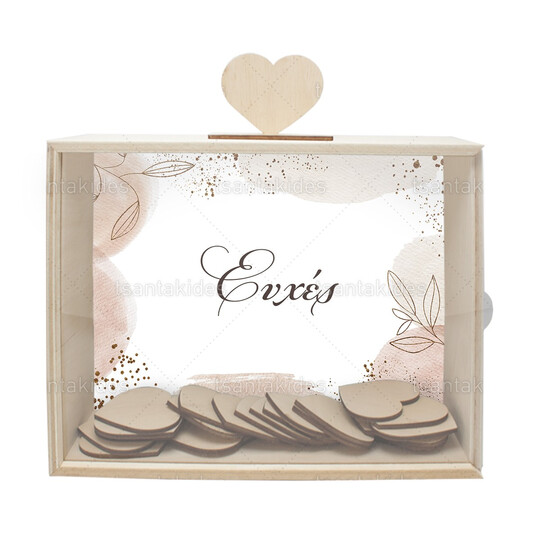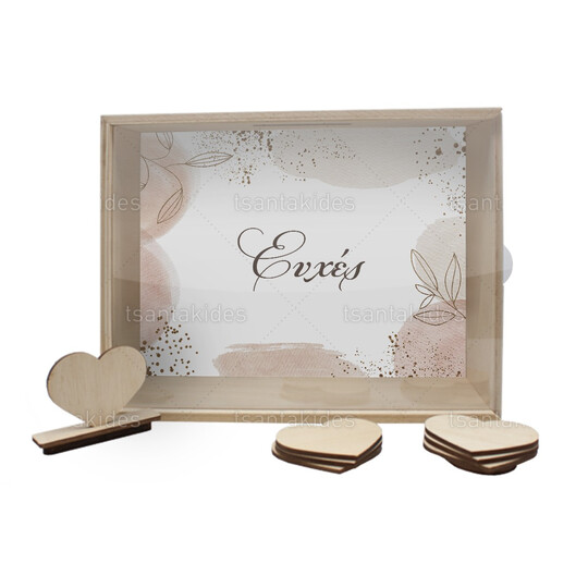 Το κουτί συνοδεύεται από 50 ατύπωτες ξύλινες καρδιές για τις ευχές και μια ξύλινη καρδιά-καπάκι για την θυρίδα στο πάνω μέρος του κουτιού.