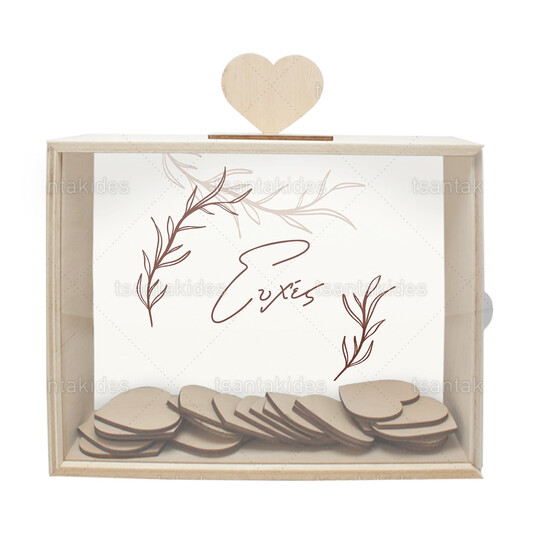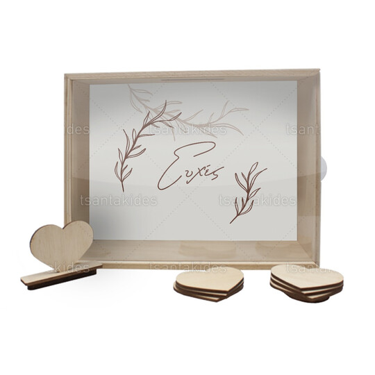 Το κουτί συνοδεύεται από 50 ατύπωτες ξύλινες καρδιές για τις ευχές και μια ξύλινη καρδιά-καπάκι για την θυρίδα στο πάνω μέρος του κουτιού.