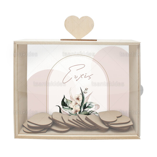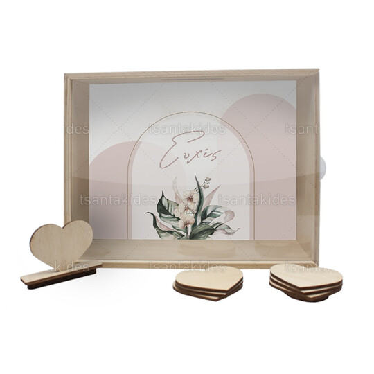 Το κουτί συνοδεύεται από 50 ατύπωτες ξύλινες καρδιές για τις ευχές και μια ξύλινη καρδιά-καπάκι για την θυρίδα στο πάνω μέρος του κουτιού.